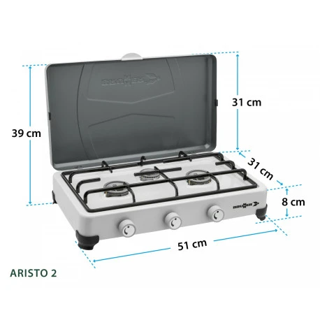 Fornello gas a 3 fuochi stabile e compatto, dotato di coperchio.Â