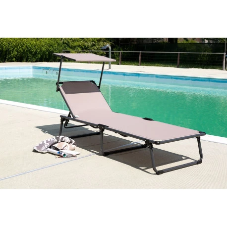 Lettino da sole a tre gambe con pratico tettuccio parasole. Reclinabile, pratico da trasportare, struttura pieghevole in alluminio. Rivestimento resistente in textilene. Ideale per la spiaggia e la piscina.