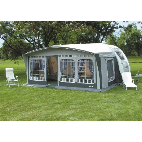 Veranda per roulotte con tetto in poliestere bispalmato PVC (530gr/mq), cavetto termosaldato, pareti laterali in tessuto poliestere bispalmato PVC Mehler da 480 gr/mq e paleria in alluminio anodizzato (diam. 26mm).